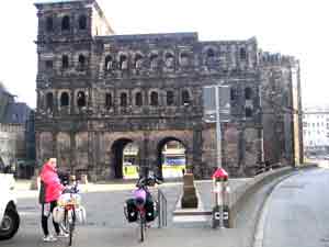 Im Dom ist gerade Messe. Danach fahren wir zur Porta Nigra, aber auch da müssen wir warten, bis der Supermarkt öffnet. Die Fußgängerzone ist noch ruhig, sodaß wir einfach drüberradeln können. Zwischenzeitlich kaufen wir belegte Brötchen, bevor es Apfelschorle in 1,5 L Pack gibt. Dann zum Dom zurück. Gerne bekommen wir die hübschen Stempel, machen ein Foto vom ersten Jakobsweg-Zeichen und radeln nach St. Matthias, dem einzigen Apostelgrab nördlich der Alpen. Auch hier macht man uns gerne einen Stempel in unseren Pilgerpass.