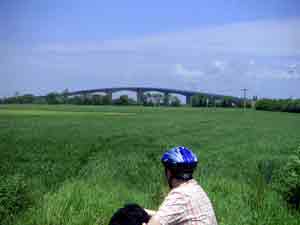Direkt über die 40 m hohe Autobrücke (mit Radstreifen) über das riesige Mündungsbecken der Seudre. Während ich am Mittelscheitel auf meine Mitradlerin warte, stelle ich mit Entsetzen fest, daß meine Vorderlampe abgebrochen ist