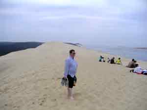 Die Düne wird über eine Treppe aus Plastikfertigstufen erklommen. Da ist ganz schön Betrieb, besonders viele Schulklassen waren auf Ausflug da. Oben, auf 117 m über dem anbrandenden Meer, hat man eine herrliche Fernsicht. Auf der Spitze habe ich meine Sandprobe genommen.